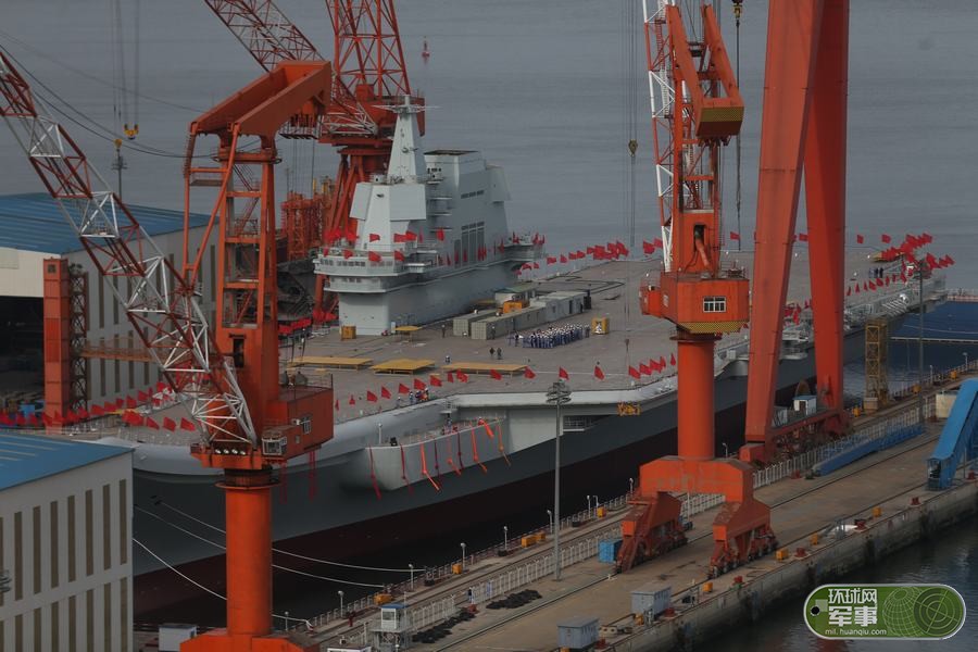【環球時報赴大連特派記者 馬俊 郭媛丹 楊升 崔萌】25日下午2時左右,《環球時報》記者注意到,位於大連造船廠船塢裏的國產航母有了新動作!工作人員正沿着船體插上一面面紅旗,似乎正在準備什麼儀式。現場圍觀軍迷們頗為興奮:是否是萬眾期盼的下水儀式臨近了?