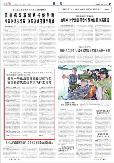 2017年4月20日19時41分,搭載天舟一號貨運飛船的長征七號遙二運載火箭,在我國文昌航天發射場點火發射,約596秒後,飛船與火箭成功分離,進入預定軌道,發射取得圓滿成功。並於4月22日12時23分,天舟一號貨運飛船與天宮二號空間實驗室順利完成自動交會對接。這是天宮二號自2016年9月15日發射入軌以來首次與貨運飛船進行的交會對接。這次天舟一號飛行任務的主要特點和後續看點是什麼?天舟一號作為我國首艘貨運飛船,運輸能力如何?與國外貨運飛船相比有哪些創新?請看今日出版的《解放軍報》的報道: