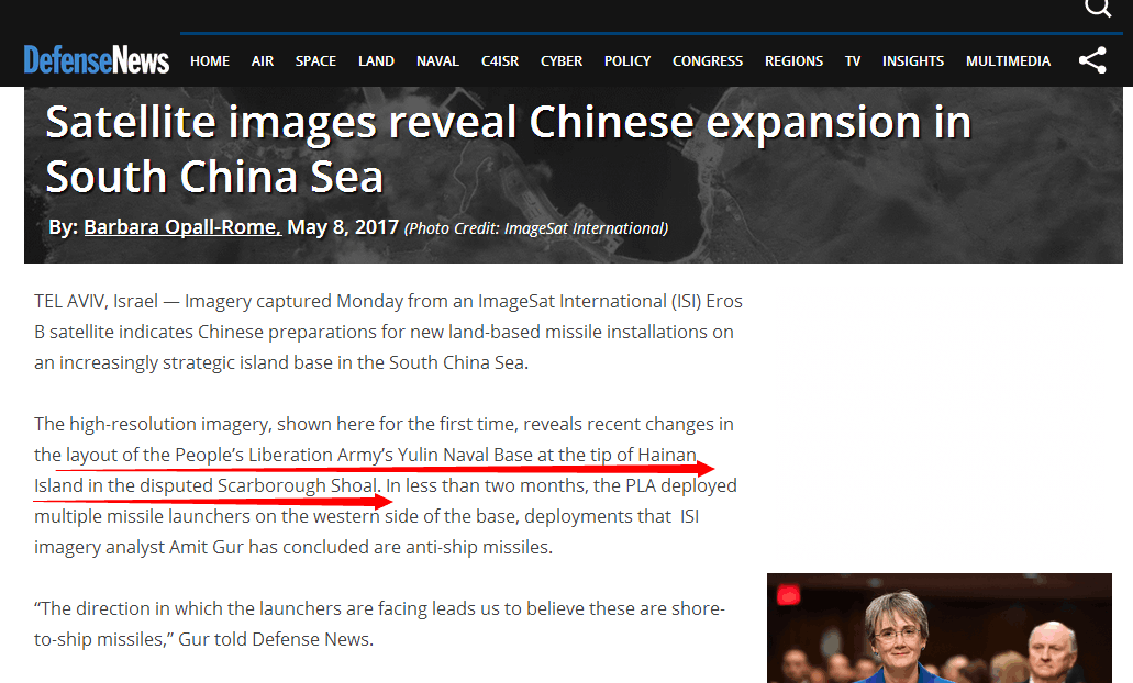 【環球網軍事報道 記者 查希】5月8日,美國媒體《防務新聞》在報道南海相關新聞時稱,以色列的衞星拍攝的照片顯示,中國在南海戰略地位愈加重要的島嶼上準備建設新的陸基導彈裝置。不過,環球網記者發現,作為美國一家著名的軍事雜誌,卻犯了一個“小兒科”式的錯誤。美媒稱該裝置建設的地點是“海南島榆林基地,‘海南島在爭議島嶼黃巖島中’”。(《防務新聞》英文原文:Yulin Naval Base at the tip of Hainan Island in the disputed Scarborough Shoal.)