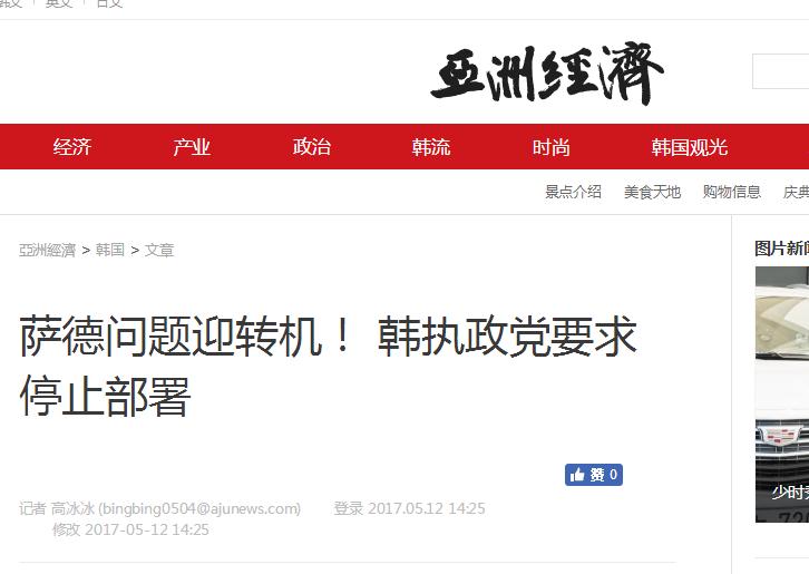 韓國《亞洲經濟》5月12日報道稱,共同民主黨“薩德”對策特別委員會12日表示,“新政府已經成立,以國防部為代表的行政部門應該立刻停止非法部署“薩德”。
