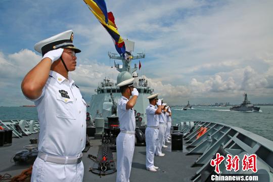 中新網樟宜港5月15日電 (徐廣 吳亢慈)當地時間15日上午,中國海軍導彈護衞艦黃山艦應邀參加新加坡海軍成立50週年國際艦隊檢閲活動,南海艦隊副司令員周煦明少將率中國海軍代表團一行5人出席檢閲。
