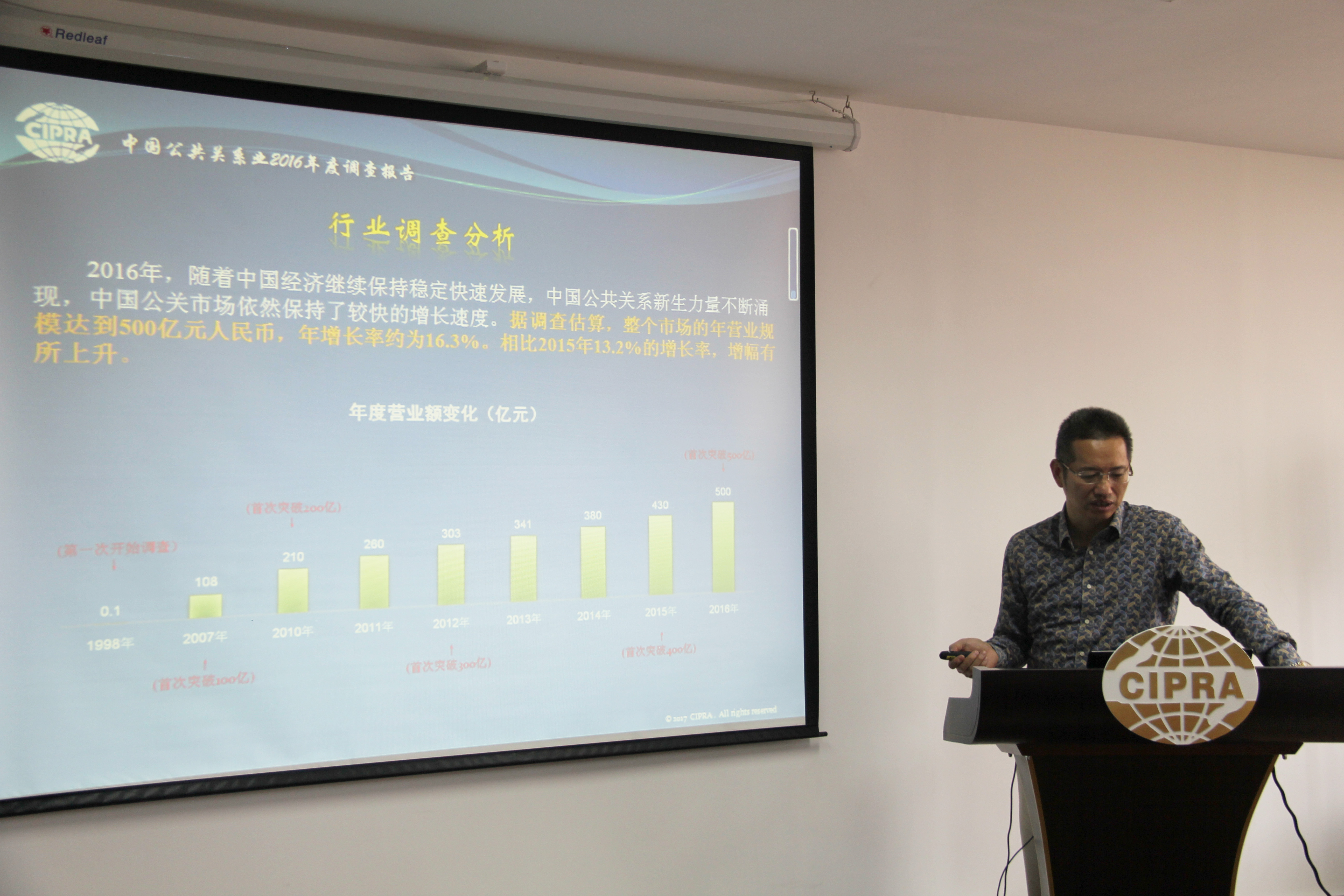 為反映2016年度公共關係服務市場的運行態勢,正確評價中國公共關係業的發展狀況,為專業機構提供積極的行業指引,2017年2月20日至3月20日,中國國際公共關係協會(CIPRA)對中國大陸境內主要公共關係公司進行調查活動。項目組採用問卷調查的方法對2016年度全國主要公關公司進行抽樣調查,內容涉及運營管理、業務發展和可持續發展等方面。