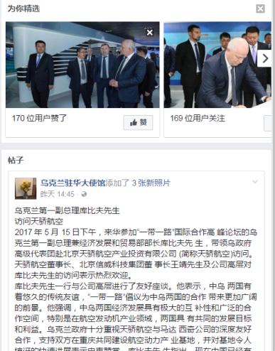 【環球網軍事報道 記者 張加軍】根據近日媒體的報道,“一帶一路”峯會剛剛結束的5月15日下午,烏克蘭第一副總理庫比夫協高級代表團就取車大半個北京,匆匆來到一家成立不久的民營企業,還十分熱情的與公司相關人員進行了合影留念。通過庫比夫本人的臉書,他本人當天就把這個消息向外界透露,並稱之為“又一個勝利”。而兩天後烏克蘭大使館的臉書也發佈了庫比夫訪問這家企業的新聞稿。