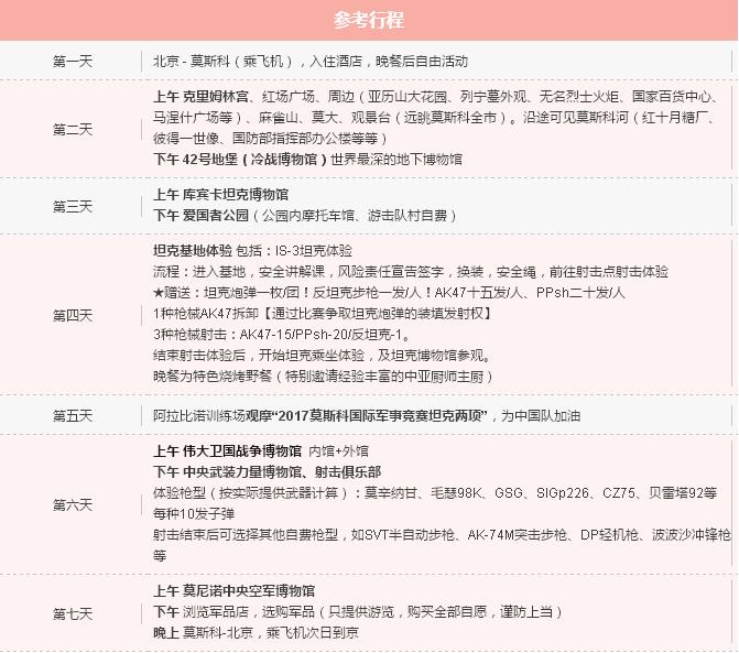 團期:2017年8月9日-16日(行程不排除根據實際情況調整、對調,但保證包含項目無變化;坦克大賽決賽日期目前未確定是12日或13日)