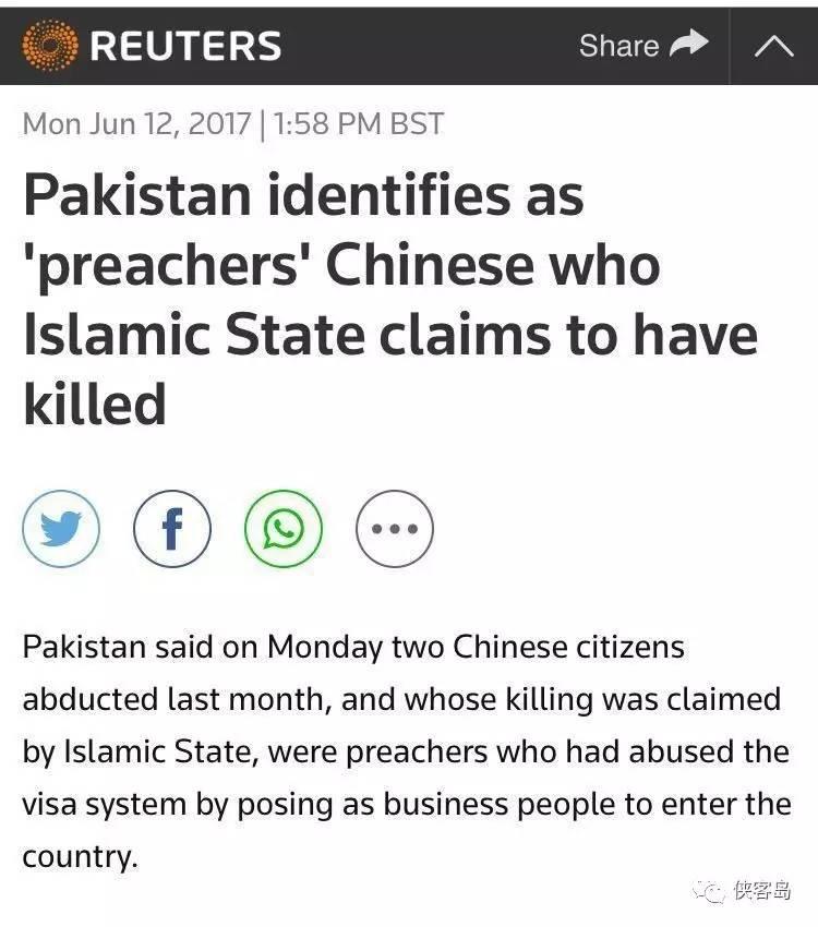 兩名中國公民在巴基斯坦境內遭到IS綁架和殺害一事,今天有了最新的進展——路透社消息稱,週一,巴基斯坦方面確認,被殺害的兩名中國公民是“傳教士”。