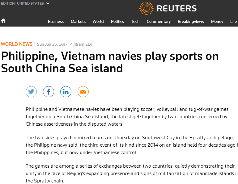 【環球網綜合報道】據英國路透社6月25日報道,越南和菲律賓海軍再次在南沙南子島舉行了所謂的“聯歡運動會”,他們進行了足球、排球、拔河等一系列比賽。