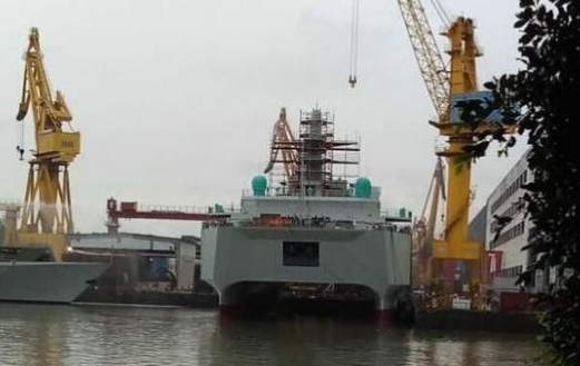 【環球網軍事6月29日報道】英國《簡氏防務週刊》網站6月22日報道稱,中國一些網絡論壇發佈的照片顯示,中國海軍正在廣州黃埔造船廠建造一艘最新設計的雙體輔助艦。該艦似乎已於近期下水,正在進行相關裝備安裝。