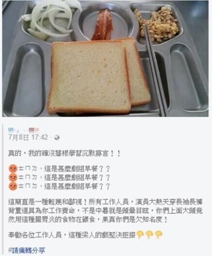 【環球網報道 記者 徐亦超】據香港“東網”7月11日報道,台當局防務部門有份參與投資並參與制作的形象劇“最好的選擇”,被稱謂台版“太陽的後裔”,製作成本估計達160億元新台幣(約合35.62億元人民幣)。但劇組開拍以來屢次傳出負面新聞,最新消息是劇組在海軍新訓中心拍戲,早餐居然是吐司配上洋葱絲。有關的早餐照片被轉載到網上後,不少網民均痛批劇組“太血汗”。