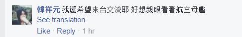 此外,一些台灣網友也對遼寧艦充滿了好奇。一位叫羅納德的網友稱:“就算來了也不會不安心啊,還想去參觀。”韓祥元則稱:“我還希望來台交流耶。好想親眼看看航空母艦。”