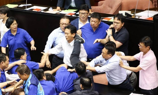 台立法機構近日針對“前瞻計劃”召開第2次臨時會,繼13日國民黨“立委”許淑華打了民進黨“立委”邱議瑩一巴掌後,14日繼續召開第2次臨時會,但現場又爆發“全武行”,國民黨“立委”再度拿出汽笛喇叭、大灑假鈔、砸水球,雙方便扭打成一團,國民黨“立委”顏寬恆與民進黨“立委”吳秉睿更互丟椅子,國民黨“立委”們更直朝“立法院長”蘇嘉全扔水球,場面十分火爆。