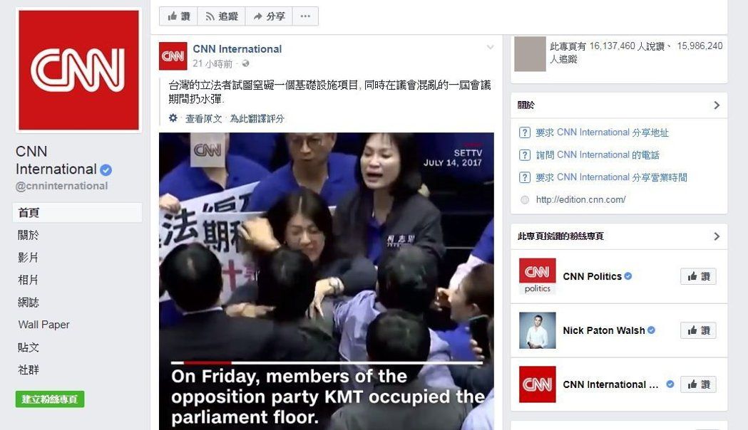 美國有線電視新聞網“CNN International”的臉書專業上當地時間14日晚間發佈一條則台灣“立法院”內“立委”大打出手的視頻,表示部分台灣“立委”為審議“基礎建設計劃”預算爆發衝突,就連水球都登場。