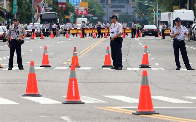 蔡英文17日到台中出席亞洲台商年會,警方在二個路口外就設置重重路障,管制抗議民眾。(圖片來源:台灣《中時電子報》)