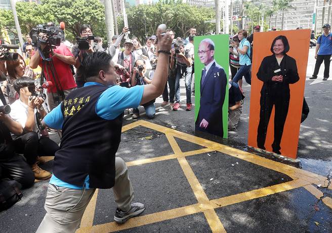 蔡英文與林全的滿意度不斷下降。圖為民眾以雞蛋和水球怒砸蔡英文和林全的人型立牌。(圖片來源:台灣“中時電子報”)