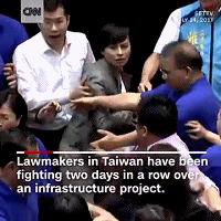 這兩天,台灣立法機構變成了“武鬥場”。圍繞蔡當局的“前瞻基礎建設計劃”,藍綠雙方展開了激烈的較量,砸水球、扔椅子、撒假鈔、鳴喇叭,女“立委”們甚至一言不合就互扇巴掌。如此“盛況”也讓《時代週刊》、CNN、BBC等外媒看得目瞪口呆,爭相報道。