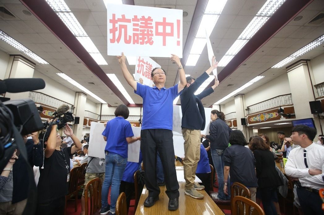 台當局審前瞻基礎建設計劃第1期特別預算案 ,民進黨霸佔主席台,國民黨抗議。(圖片來源:台灣《聯合報》)