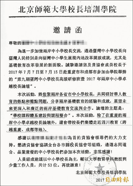 親綠台媒28日曝出一張邀請函,報道稱北京師範大學本月中旬邀請超過五十位台灣中小學校長赴大陸,邀請函表明,將匯聚“兩岸各省市”中小學校長,研討華人教育的熱點和難點問題,“通過中小學校長向台灣人民特別是向台灣中小學生展現內地改革開放成就”,尤其是基礎教育改革的新面貌。
