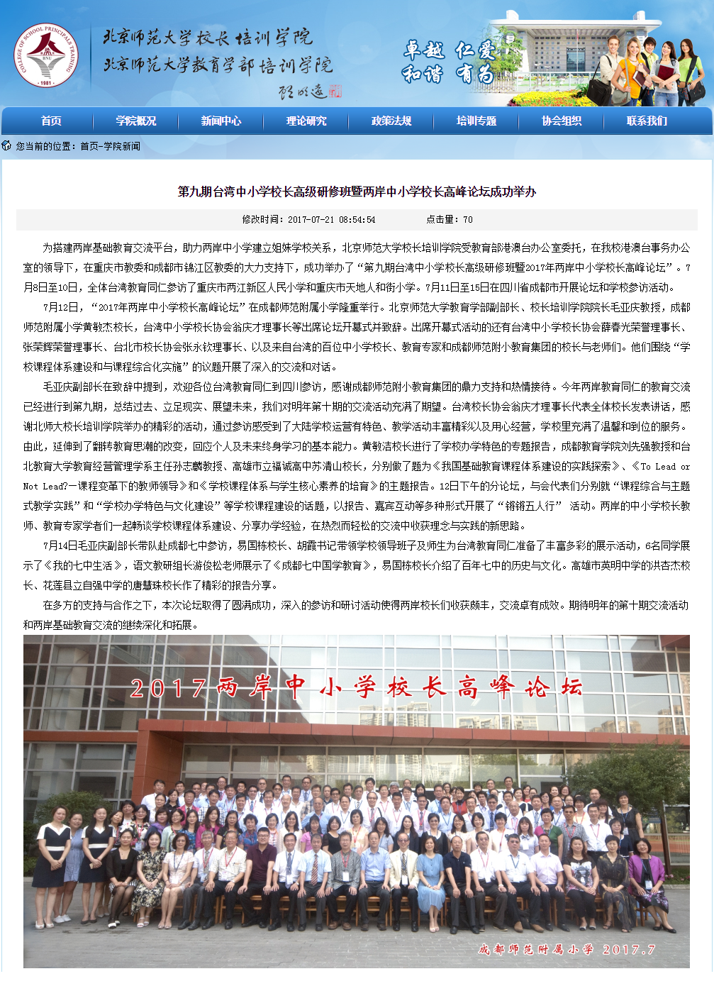 經查證,北京師範大學校長培訓學院的主頁上顯示,第九期台灣中小學校長高級研修班暨兩岸中小學校長高峯論壇已於7月中旬成功舉辦。據報道,7月8日至10日,全體台灣教育同仁參訪了重慶市兩江新區人民小學和重慶市天地人和街小學。7月11日至15日在四川省成都市開展論壇和學校參訪活動。深入的參訪和研討活動使得兩岸校長們收穫頗豐,交流卓有成效。