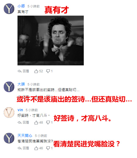 不但如此,相關新聞由親綠媒體曝出,引得不少台灣網友留言:“莫非良心發現?還是籤詩太真實,不得不報?”“老天有眼,讓人民警惕”,“多行不義天必譴”等留言,也得到網友大力點贊。