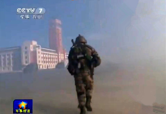 報道視頻3分鐘左右時,一位參演戰士正在向一幢紅白相間、有高大塔樓的5層建築衝鋒。這座建築無論從結構還是外觀上都與台灣所謂“總統府”高度相似。