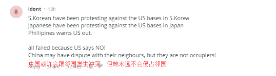 還有網友説,韓國曾對美國駐韓軍事基地提出過抗議,日本也曾抗議過美駐日軍事基地,菲律賓還希望美軍滾出菲領土呢,但他們最終都失敗了,因為美國不同意呢~你們看,中國就不會這樣,因為中國或許會與鄰國發生衝突,但她不會去侵佔別國的領土!