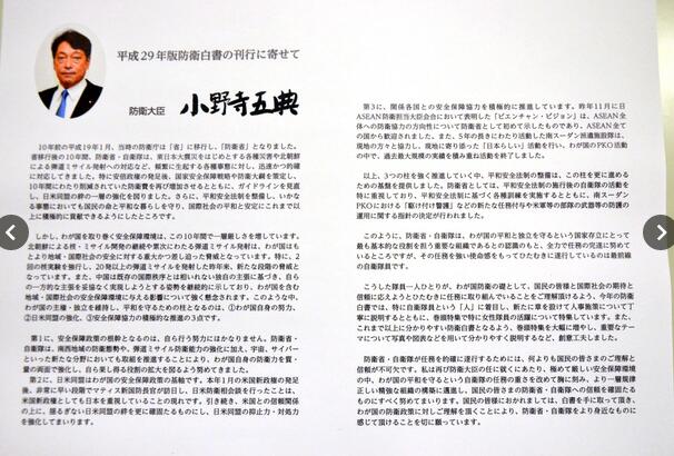 據《朝日新聞》報道,2017年《防衞白皮書》因前防相稻田朋美的下台而推遲了一週發佈。“稻田版”防衞白皮書最終成泡影。不過,“小野寺版”與“稻田版”的不同,只是卷首的防相頭像和名字改了改。