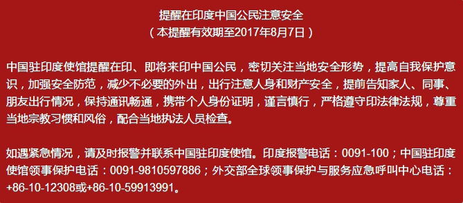 今年7月7日,中國駐印度使館曾發佈“在印中國公民安全公告”: