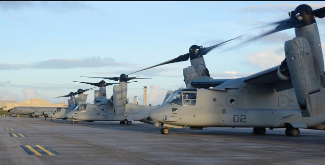 “魚鷹”運輸機是一種傾轉旋翼機,即可像直升機一樣升降,像飛機一樣飛行。按日本媒體説法,美軍現階段在沖繩普天間基地部署了20多架MV-22型“魚鷹”。