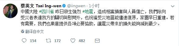 據台灣“中央社”報道,對於四川地震,蔡辦今日上午最先發聲,並表示“我們除向受災者表達關切與慰問,也祝福受災地區能儘速復原,家園早日重建。”隨後,台陸委會、海基會相繼表示“願意提供必要幫助”。
