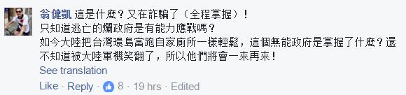 台灣網友的留言中,“台當局詐騙論”獲贊最多,名為翁健凱的台灣網友就怒斥:“這是什麼?又在(用全程掌握這個詞)來詐騙!只知道逃亡的爛當局有能力應戰嗎?如今大陸把台灣環島當跑自家廁所一樣輕鬆,這個無能的當局是掌握了什麼?還不知道被大陸軍機笑翻了,所以他們將會一來再來!”