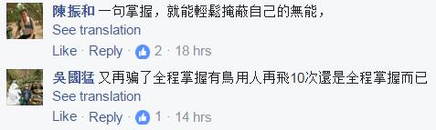 網友們一致要求台當局不要侮辱民眾的智商。網友陳振稱:“一句掌握,就能輕鬆掩蔽自己的無能。”而吳國猛更是附和道:“又在騙了,全程掌握有什麼用。人家再飛10次(台當局)還是全程掌握而已。”