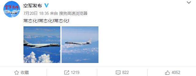 實際上,解放軍軍方7月已多次派出轟-6戰機繞飛台灣島。中國空軍官方微博“空軍發佈”7月20日發佈了兩張戰機飛行,配文稱“常態化!常態化!常態化!”對此,台防務部門也稱,近期解放軍軍機、船艦頻繁執行跨區遠海長訓,未來可能成為常態活動。
