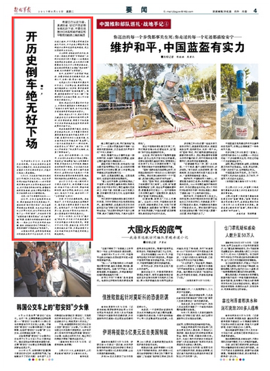 希望日方以史為鑑、真誠反省,切記開歷史倒車絕無好下場,不要在損害中日關係和破壞地區和平穩定的歧路上越走越遠。請關注今日出版的《解放軍報》評論文章——