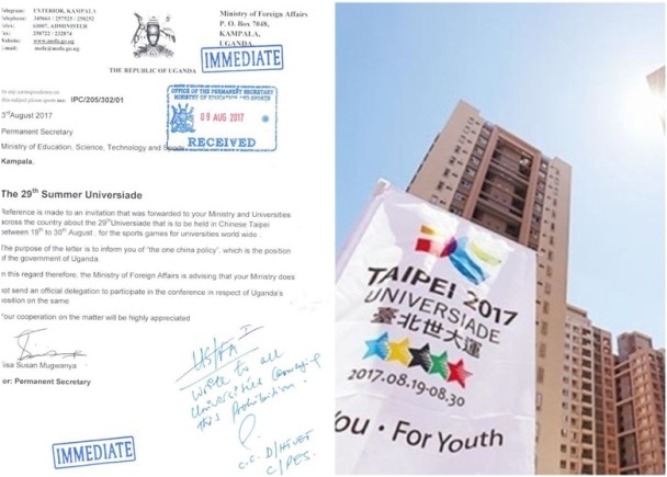 媒體報道,烏干達世界越野協會媒體公關執行長凱坦德(Norman Katende),在推特上爆料,烏干達遵守“一箇中國”,不准他們的世大運代表隊來台北參加今年的世大運。