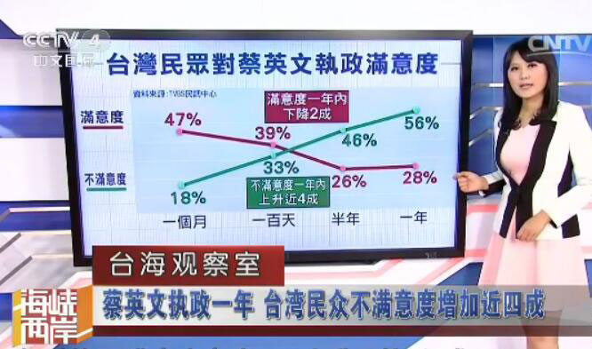這並非蔡英文民調首次出現2字頭。據海外網早前報道,蔡英文執政已滿一年之際,台灣TVBS公佈民調,蔡英文滿意度僅剩21%,下滑至新低點,而不滿意度則高達63%。