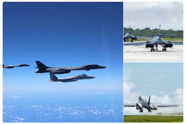 日本航空自衞隊16日也發佈消息稱,當天上午,那霸基地的兩架F-15戰鬥機與美國關島飛來的兩架B-1轟炸機在東海上空進行了編隊飛行訓練。