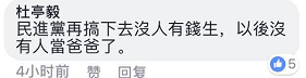 對於蔡英文當局的一系列違反民意政策,島內部分民眾已經絕望,稱“民進黨再搞下去就沒人有錢生孩子,以後沒有人當爸爸了”,“如果你爸爸還在,他不會讓你這麼亂搞的”。(綜編/海外網 朱簫)
