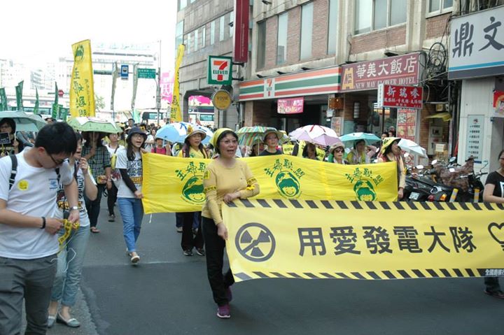 2015年台灣進行反核遊行,蔡英文當時也現身,提出2025非核家園的目標以及具體做法。參加遊行的民眾舉着“核電長辭”的毛巾,表達反核立場。在遊行隊伍中,還出現了“用愛發電大隊”“用愛發電,有愛無限”等標語。