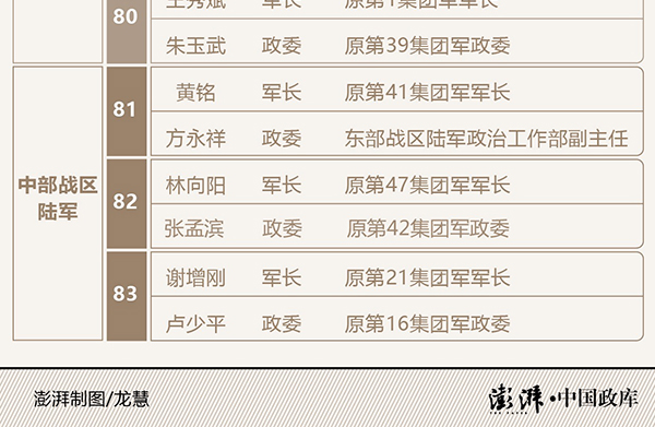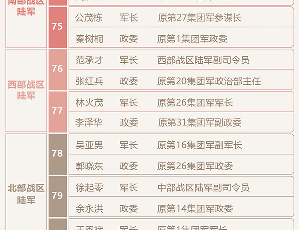 具體情況分別是:第71集團軍軍長王印芳、政委徐德清;第72集團軍軍長朱曉輝、政委王文全;第73集團軍軍長鬍中強、政委楊誠;第74集團軍軍長徐向華、政委劉洪軍;第75集團軍軍長公茂棟、政委秦樹桐;第76集團軍軍長範承才、政委張紅兵;第77集團軍軍長林火茂、政委李澤華;第78集團軍軍長吳亞男、政委郭曉東;第79集團軍軍長徐起零、政委餘永洪;第80集團軍軍長王秀斌、政委朱玉武;第81集團軍軍長黃銘、政委方永祥;第82集團軍軍長林向陽、政委張孟濱;第83集團軍軍長謝增剛、政委盧少平。