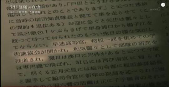 解説員:“731部隊”實施實驗的(地點),是位於中國東北部舊滿洲的秘密研究所。活生生地被當成試驗材料而死去的人,據説達到了3000人以上。為何人體試驗會被推進到如此規模?NHK電視台從國內外收集到了數百件資料。浮出水面的,不僅是日本軍人,還有從東京大學、京都大學等調集而來的“精英醫學者”,(他們)也主導着人體試驗這一實際事態。