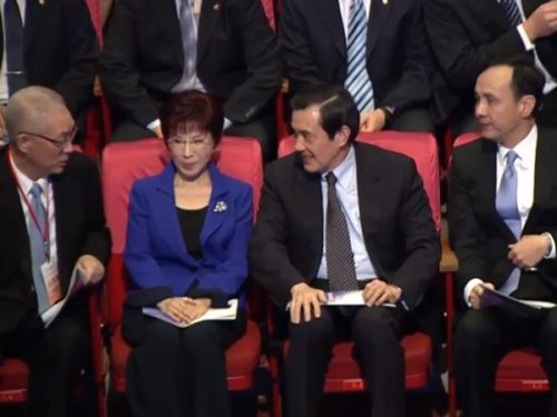 資料圖:國民黨第19次全黨代表臨時會議上“柱下朱上”,馬英九撇過洪秀柱同吳敦義交談(圖源:星島環球網)
