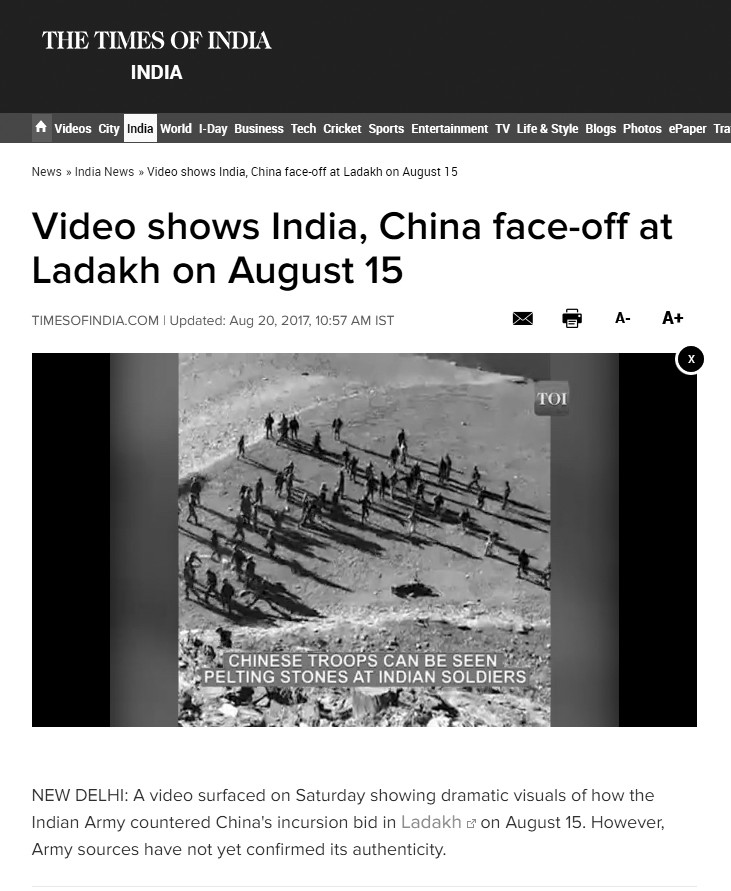 此外,從19日晚起,印媒開始大肆報道一段突然出現在網上的“印中軍人拉達克衝突”的視頻。《印度教徒報》20日稱,視頻顯示中方士兵先推搡印方人員。該文援引一名視頻發佈者的話説:“是他們(中方士兵)先動手,我們的軍人只是在反擊”。《教徒報》稱,該視頻展現出醜陋的打羣架場面,也反映了洞朗長期對峙下中印兩軍緊繃的神經。印度《第一郵報》20日則宣稱,世界上兩方士兵互扔石頭的事件少之又少,此事反映出“中國對洞朗對峙有多麼的失望。”