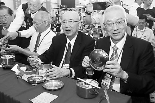 圖片説明:吳敦義(右)20日中午跟參會人士一起吃“黨徽便當”。