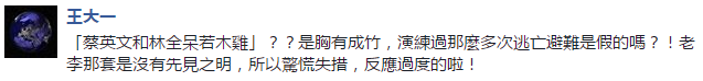 黃創夏聲稱,“729大停電”當晚,斷電訊號一發生,“李登輝的第一個動作是抓起機密電話,啓動一切早就規劃且演練的動作”。“調集可用能源,第一優先提供給雷達、機場港口和導彈部隊以及各大機動裝甲旅,確保台灣有反制任何攻擊的準備。並電令交通部門負責人,清查天上的飛機、海上的船艦和鐵軌上的火車是否安全”。黃稱,“這一切搞定後,李登輝才打電話給經濟部門負責人,詢問為什麼會斷電”。而這次大停電前5個小時,蔡英文和林全除了寫臉書之外就是呆若木雞,還無視大陸軍機頻頻繞台的險峻,將責任歸咎到一個工人身上。
