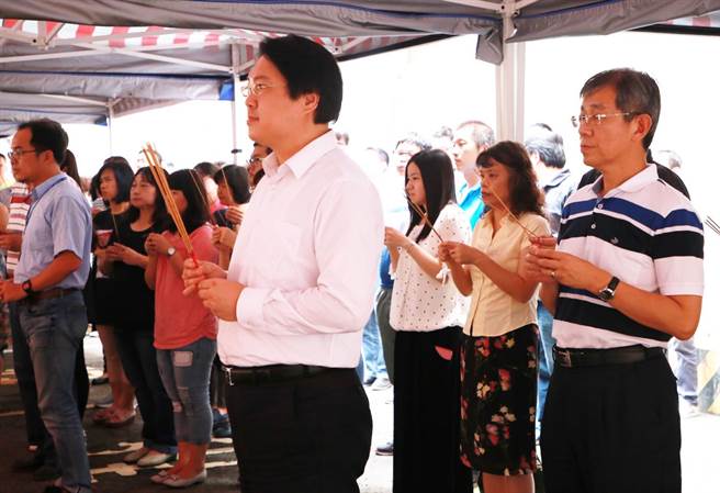 林右昌不慎遭到隨員開車門時撞擊到臉部,造成右眼周圍受傷,今午帶傷參加市府舉辦的普渡行程。(圖片來源:台灣《中國時報》)