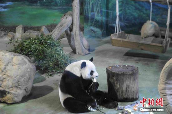 8月29日,是自大陸來台已經9年的大熊貓團團和圓圓13歲生日。台北市動物園當天為“夫妻”倆舉行生日派對,慶祝他們的13歲生日。圖為圓圓吃甘蔗。中新社記者 蔣雪林 攝
