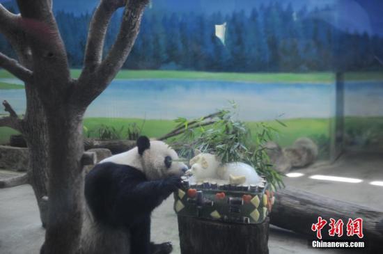 上午11時5分,保育員為團團擺放好生日蛋糕。只見團團從柵欄後慢慢走來,熟門熟路地走到生日蛋糕旁,慢條斯理地用爪子碰了一下蛋糕,試圖刨開鑲在冰塊裏的甘蔗,進食模樣相當秀氣。
