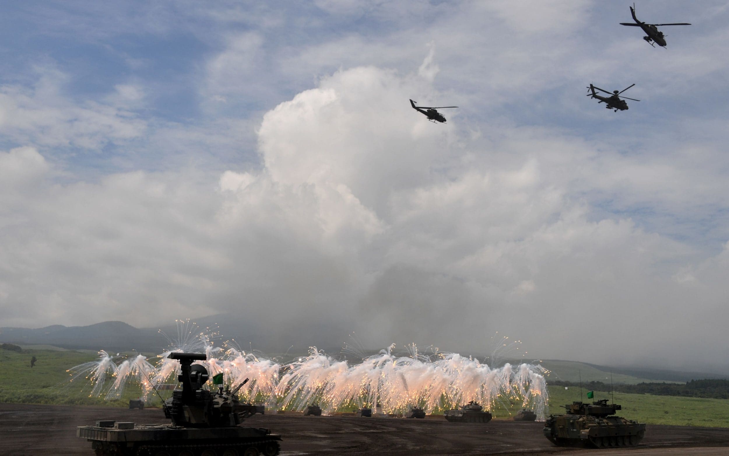 52歲的森忍和女兒一起開車,從200公里以外來到富士山,觀看這裏一年一度的戲劇般的軍事演習,森忍説她喜歡看演習,但希望這些炮火永遠不會真正派上用場。“我是在和平時代長大的,”她説。“所以我想讓下一代也享受和平。”