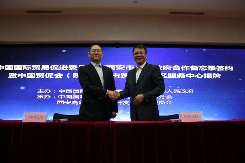 8月31日,西安市政府與中國貿促會合作備忘錄簽署儀式暨中國貿促會(陝西)自由貿易試驗區服務中心揭牌儀式在西安隆重舉行。合作備忘錄商定雙方在促進對外貿易投資合作,開展國際交流,提升西安市會展業水平,加強涉外商事法律工作,支持陝西自貿試驗區西安片區建設,開展政策研究和培訓工作等九個方面開展深入合作。中國貿促會(陝西)自由貿易試驗區服務中心同時揭牌,該服務中心將根據片區功能定位、發展戰略和企業實際需求,統籌協調貿促會全系統的渠道資源和專業服務,為政府部門和企業提供個性化的服務、就近服務。