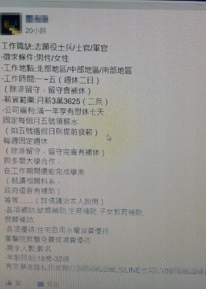 報道稱,經向發出該招募啓事的陳姓男子詢問,證實他由於招募人才的業績壓力,才上臉書平台徵人,該篇貼文提到工作職缺是“志願役士兵/士官/軍官”,月薪33625元新台幣、特休7天等福利,還要求年齡18至32歲,除留下發文者的聯絡電話,還註明可以加LINE好友聯繫。