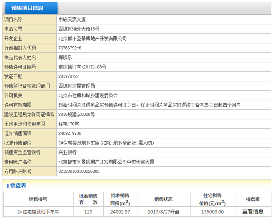 根據北京市住建委官網公示的預售商品房住宅信息顯示,該項目案名為中駿天辰大廈,位於西城區北二環,緊鄰德勝門,屬於中駿置業“天”字系高端產品系。同時,此次獲批銷售120套住宅,面積約2.4萬平方米。據瞭解,該項目已於8月27日開盤,擬售價格13.5萬元/平方米。